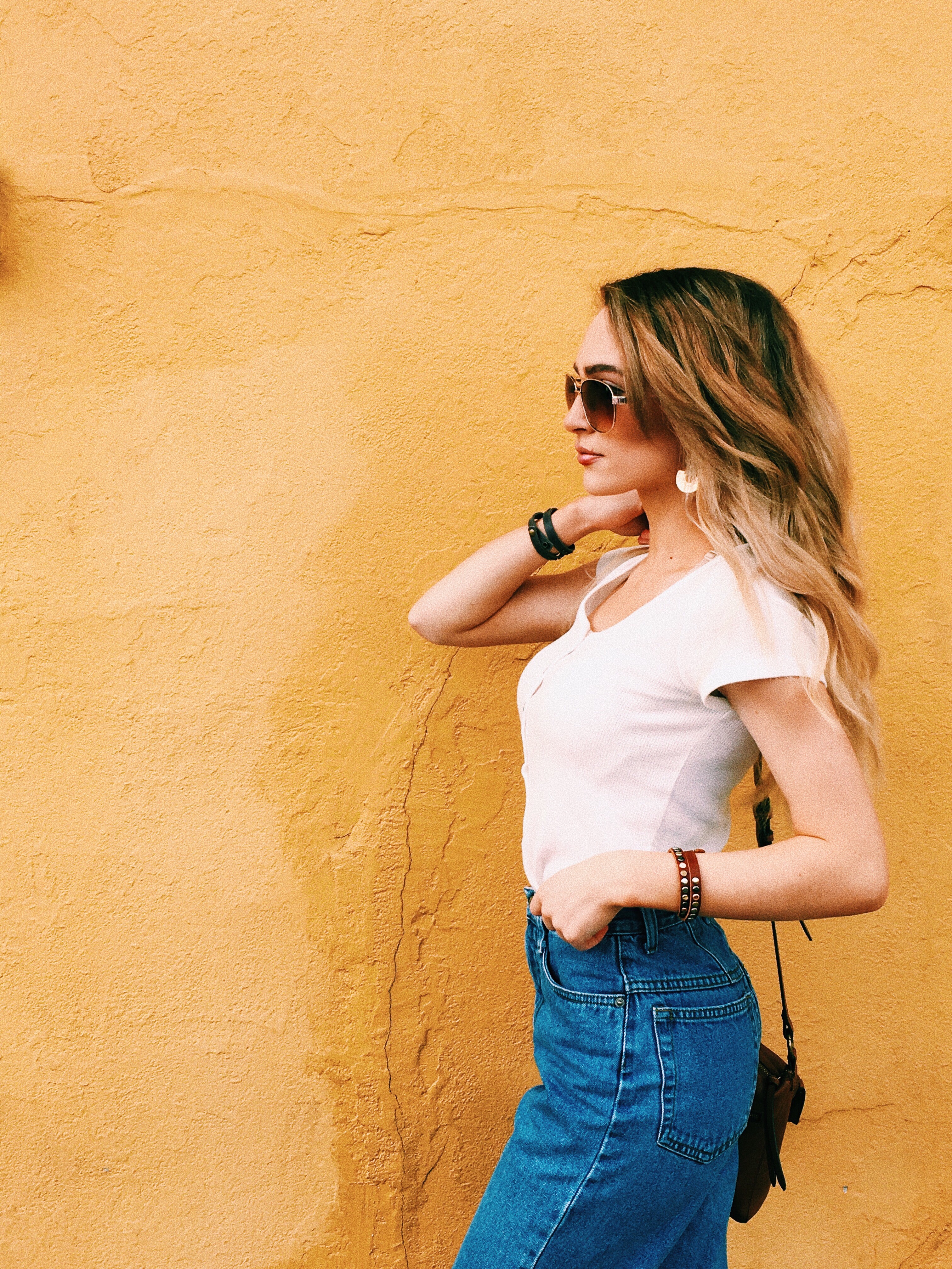 A typical outfit of mine…I like pairing basic colors, such as a white tee, with vintage jeans and accessorize with textured jewelry.