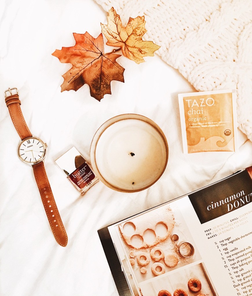 For the background, I arranged some of my favorite fall items on a white background with a textured blanket, and edited it to be clearer and brighter. The background has my favorite brand of chai tea, a peak of a fall donut recipe, one of my favorite watches to wear in the fall, a maroon colored nail polish (because of fall color trends but also Go Cougs…) and simply some decorative leaves. These were all materials I have myself so it was nice to be able to design something around that.