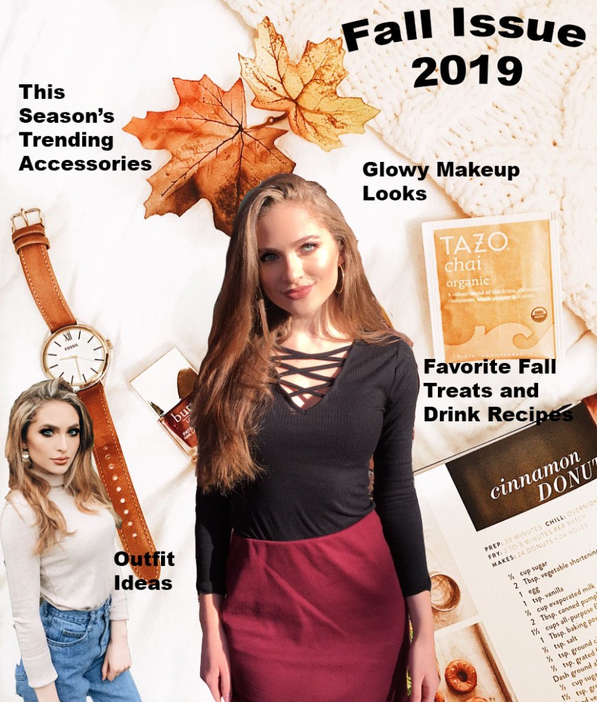 For this assignment, I tried to create a magazine cover. This relates to my topic of fashion because it is supposed to be a fall fashion magazine issue. I had my sister take two photos of me in my favorite fall outfits for my use, and with permission of course to use them, cropped and edited the photos to fit the way that I wanted on the cover. I have always liked to read fashion magazines that were geared towards my age group when I was a teenager, such as Seventeen Magazine, J-14, and more. Most inspiration is from one of my favorite sections in the magazine, which is the clothing piece recommendation section/fashion advice. I liked seeing what was trending, and lately “mom-jeans” have been in style, so I decided to include an outfit with that style on the “cover” of the magazine.