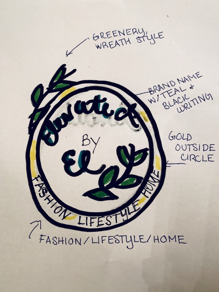 Here is a rough sketch for my logo. I plan on having it in the shape of a circle, white with gold on the outside, some green leaves surrounding it and the brand name, Elevated by El. Underneath it will say “Fashion, Lifestyle, Home” to get a general idea of what the brand is about.